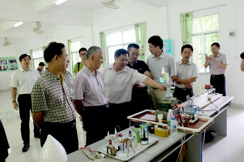 在工作室,大家参观体验了学校师生的科技创新作品,“利用特斯拉电弧演示尖端放电”的教具、仿生物学的“机器虫”、利用虹吸原理展示的“会生气的鸡蛋”……参观者都被这些作品深深吸引了。吴焕泉副主席对罗伟群老师的辛勤付出和对科技教育孜孜不倦的热情给予高度评价,希望像罗伟群老师一样的教育团队要不断发展壮大,希望山区科技教育的星星之火要不断燎原,希望边远农村地区的青少年都能插上科学翅膀在梦想的天空翱翔。