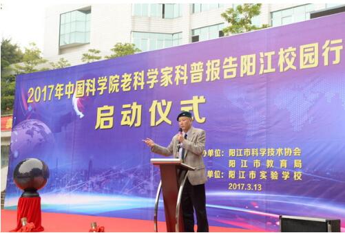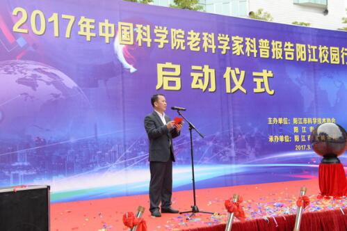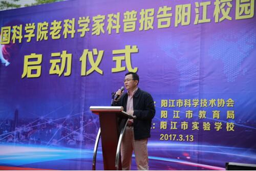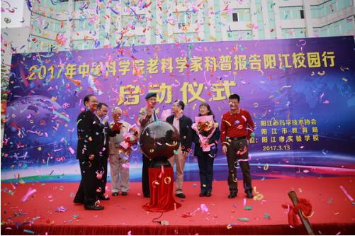 3月13日上午,由阳江市科协、阳江市教育局共同主办的“2017年中国科学院老科学家科普报告阳江校园行”启动仪式在阳江市实验学校举行。阳江市副市长蔡德威、市教育局副调研员梁山和老科学家代表陈洪教授出席活动并讲话。副市长蔡德威、市科协主席郑辉印、市教育局副调研员梁山、市实验学校校长陈宗焕与老科学家们共同触碰启动球,宣布2017年中国科学院老科学家科普报告阳江校园行活动启动,拉开老科学家在阳江市开展科普报告校园行活动的序幕。参加启动仪式的还有阳江市科协、江城区科协全体人员,教育局有关领导,高校科协、市直有关学校的负责人等。启动仪式由郑辉印主持。