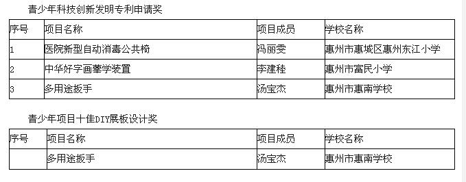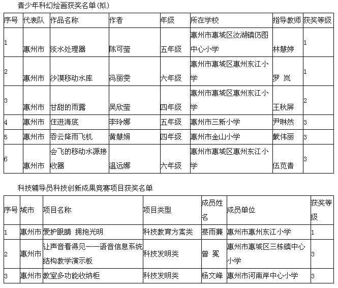 惠州市惠城区青少年选手及科技辅导员继续在本项大赛中取得优异成绩,共有13件作品获奖,其中一等奖4件,二等奖4件,三等奖5件。其中3件青少年创新发明荣获专利申请奖,1件作品展板荣获全省十佳DIY展板设计奖。东江小学的科技辅导员科技教育方案《爱护眼睛,拥抱光明》,东江小学、仍图中心小学各有一幅科幻绘画共3个作品将参加全国大赛。