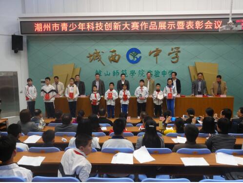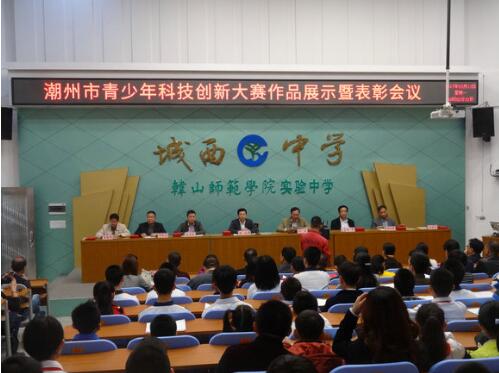 2017年3月13日上午,2016年潮州市青少年科技创新大赛作品展示暨表彰会议在湘桥区城西中学举行。市委常委、统战部部长徐和,市政协副主席、科协主席柯泓,市科协党组书记林峰、市教育局局长陈浩松、市科协副主席郑绍雄、市科技局副局长许敬阳、市教育局副调研员庄建明等领导参加市青少年科技创新大赛作品展示活动并出席表彰会议。获得本次大赛一、二等奖的学生、优秀科技辅导员、优秀组织工作者、优秀组织单位及市直、各区县科协、教育、科技、知识产权、学校的代表200多人参加了作品展示活动及表彰会。