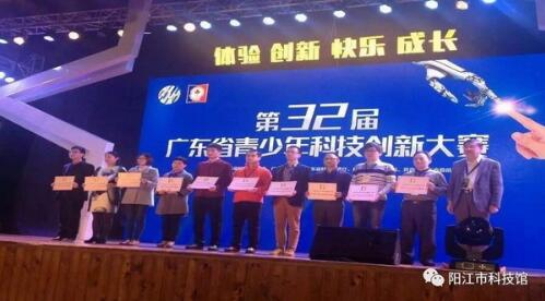 阳江市科协组织阳江市代表队参加本次大赛,他们分别是来自阳江市第一中学、阳春市中等职业技术学校、阳西县第二中学、阳东实验学校的学生和辅导老师共20多人,他们是经过第9届阳江市青少年科技创新大赛评选出8个优秀项目的作者和辅导老师。经过封闭答辩、公开展示与专项评奖三个环节评审,阳江市第一中学刘修霆同学作品《室内植物小气候控制装置》、阳春市中等职业技术学校冯永佑同学作品《旋转LED》获得青少年科技创新项目二等奖,其他作品均获三等奖。阳西县第二中学朱文强、张茂广同学的作品《太阳能自由转向小型清洁车》获天才教室创新英才专项奖,获得现金2000元和价值1000元天才教室教具一套奖励;阳江一中刘修霆获得华南农业大学丁颖创新奖,获得现金2000元奖励。此外,阳西方正中学陈画同学的《海底污染收集器》获优秀少年儿童科学幻想绘画二等奖;广东两阳中学莫志轩老师获得全省十佳优秀科技辅导员殊荣。