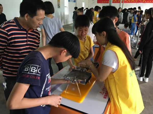 5月11日下午,“河源市科技馆科普活动进校园”走进顺天中学,开展社会主义核心价值观教育活动。 300多名师生带着对科学知识的好奇心和求知欲,兴致勃勃地参观科普展品,边听边看,边试边想,并积极与科普志愿者交流互动。 科技馆活动进校园是一场集科学性、知识性、趣味性、参与性为一体的“科普盛宴”。通过开展此项活动,引导学生透过科普展品,补充科学知识,拓宽科学视野。