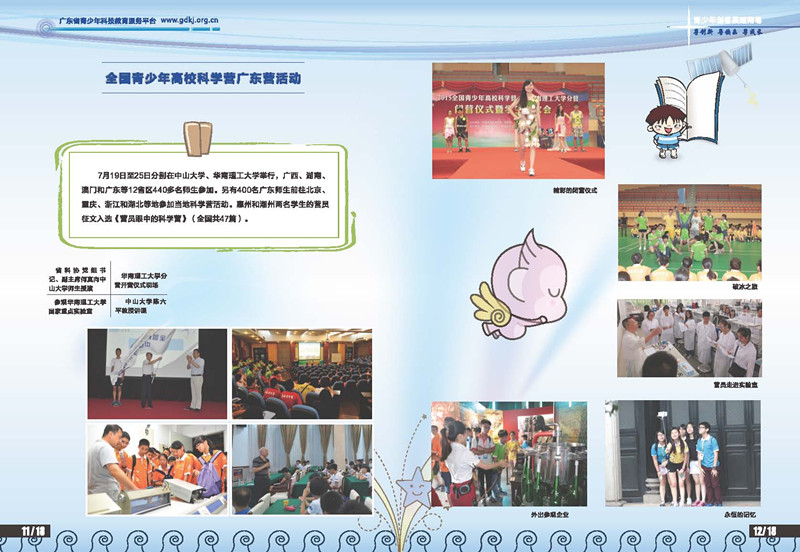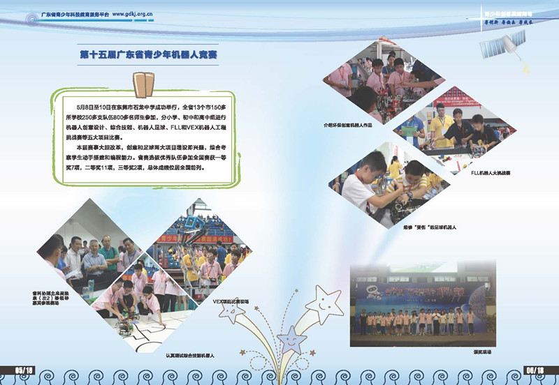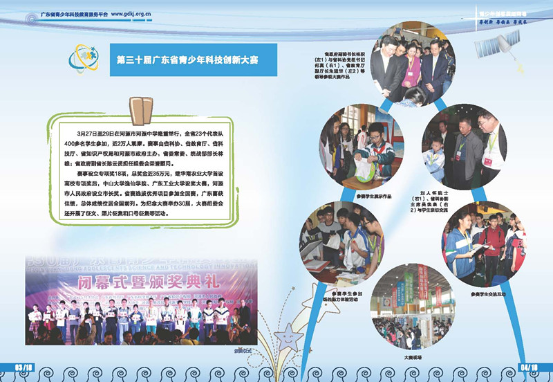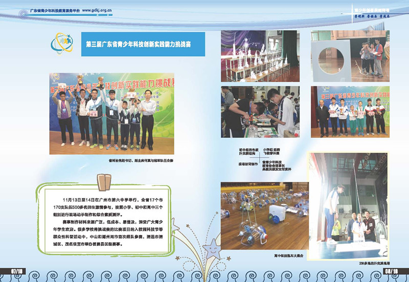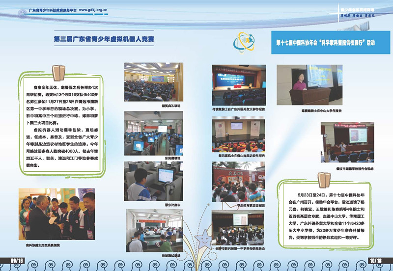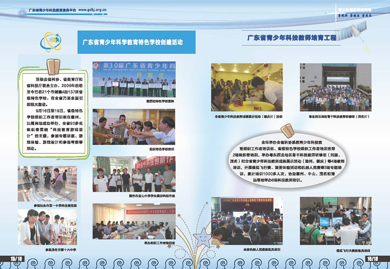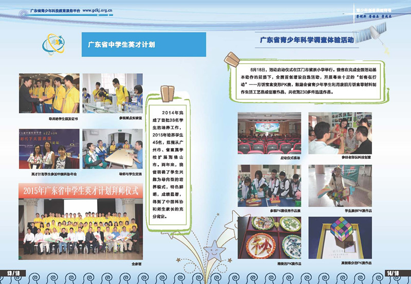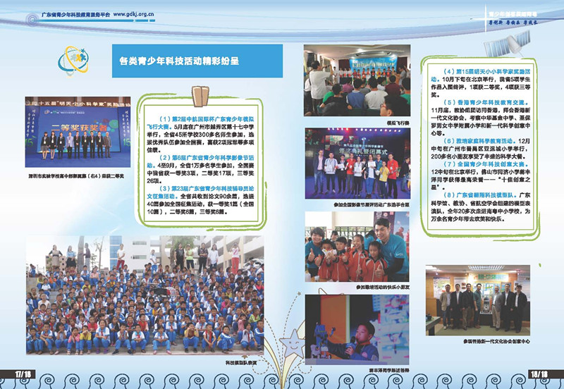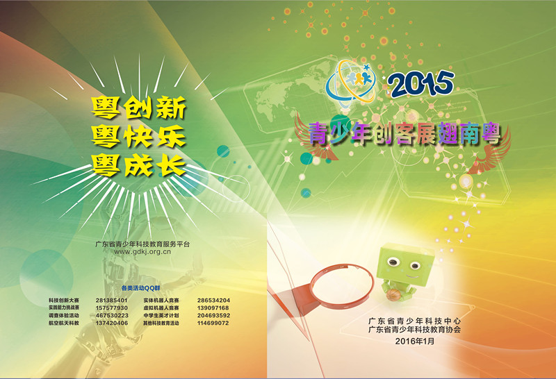 2015年,在各级科协、教育和科技部门的大力支持,全省广大师生的共同努力下,省青少年科技中心和省青少年科技教育协会不断改革,积极创新,在组织开展各类青少年科技活动、科技教师交流培训和特色学校创建活动等方面取得一定成效。为了更好总结过去一年的工作,我们编印了2015年活动小册子,以供大家共勉。 广东省青少年科技中心 广东省青少年科技教育协会 2016年1月29日 附:2015年活动小册子封面、内文PDF.zip