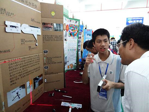 容桂中学苏铭泺同学向参观者解说作品(该作品获一等奖)